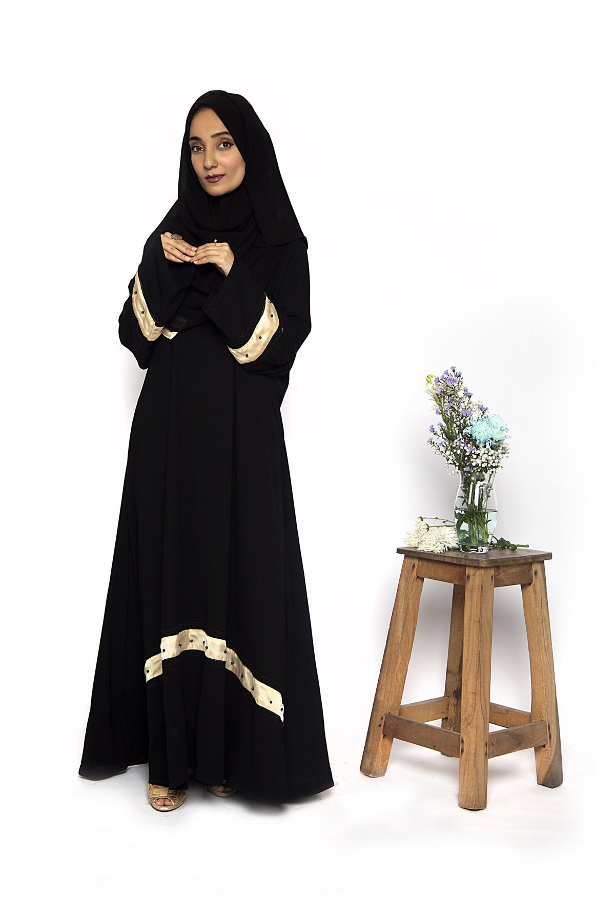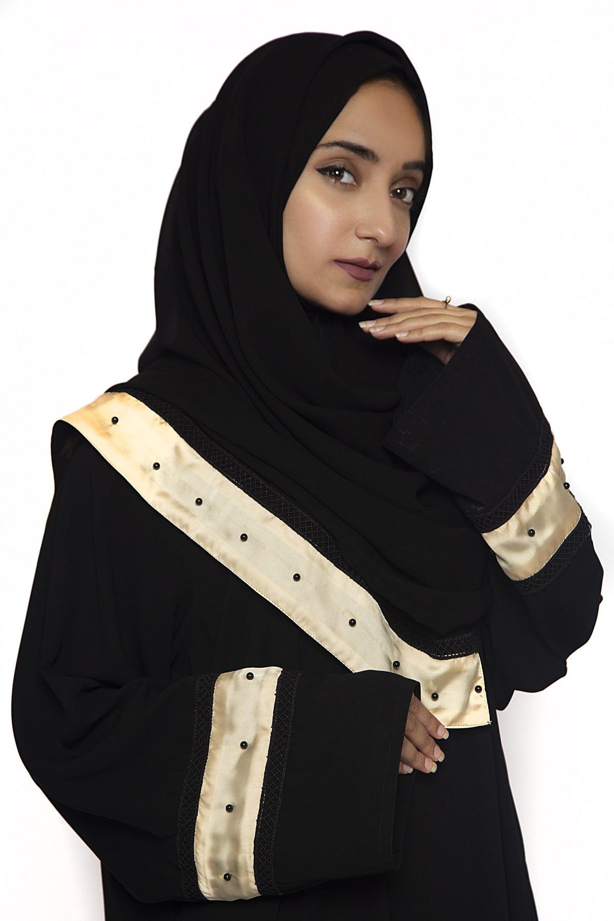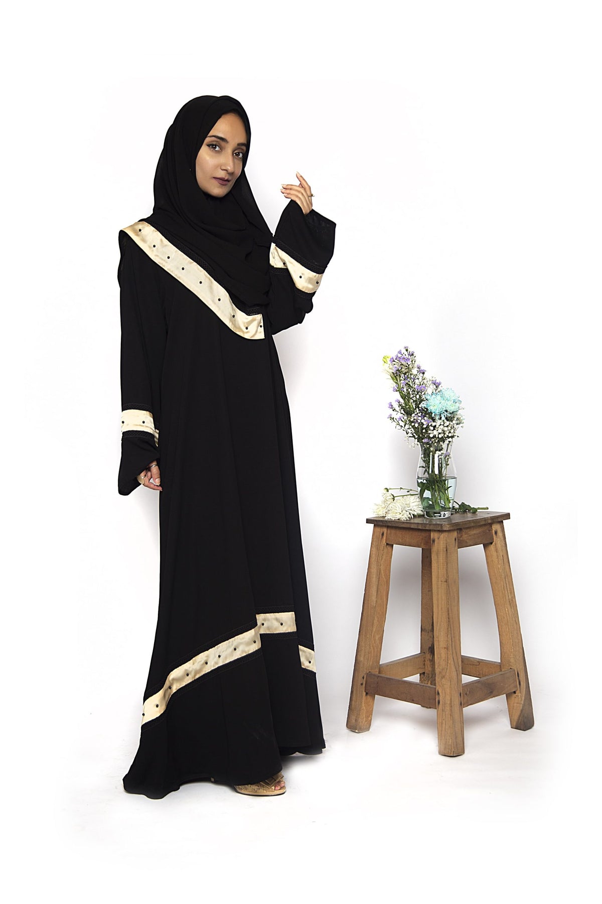 Premium Erotic Black abbaya with Silk Patti on bottom and on sleeves with Black Pearl Beads on it.