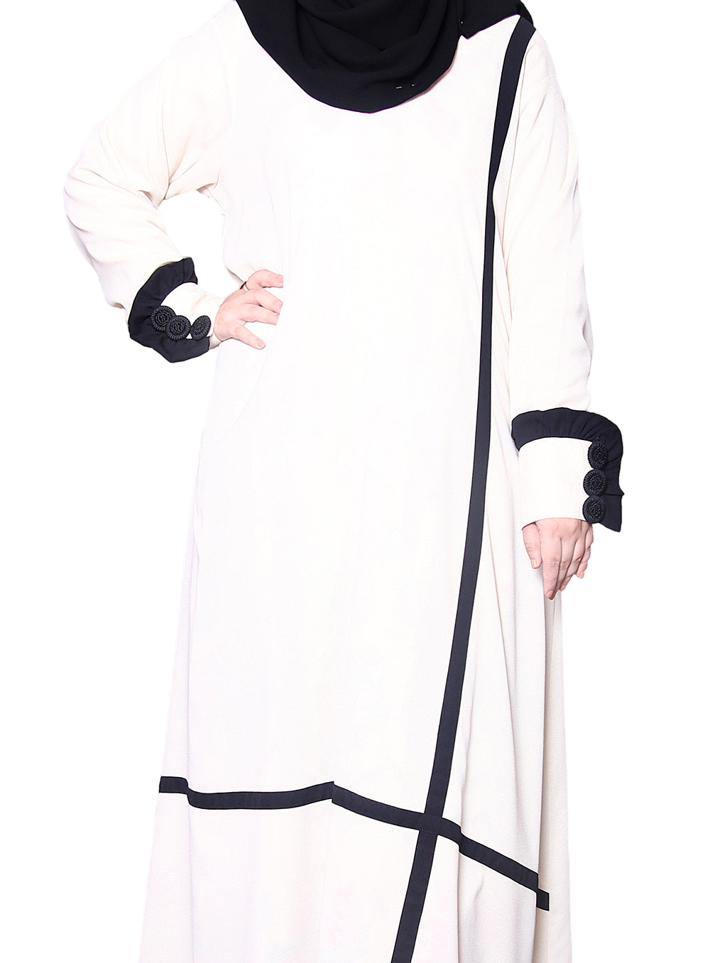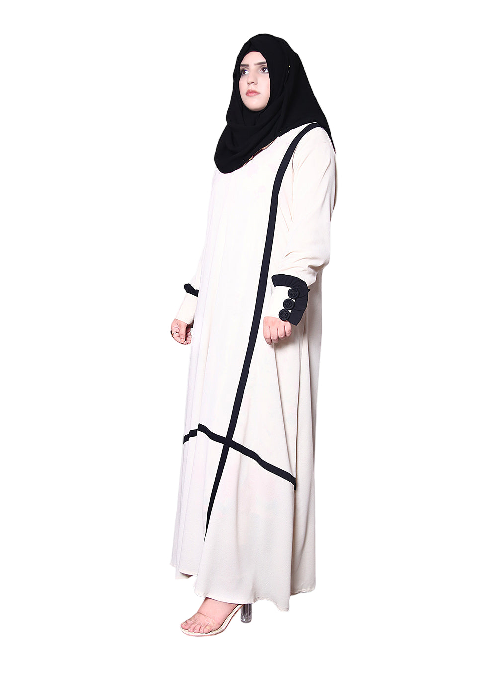 TALKING ABOUT THE STRIPE LETS COME UP WITH DIFFERENT STYLE OF STRIPE ON YOUR ABAYA WITH A LITTLE BIT SIDE PLUS STYLE. ALONG WITH BLOCK STYLE SLEEVES WITH FLURRY LACE.