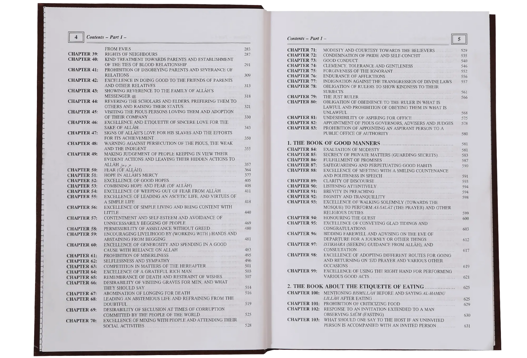 The Riyad Us Saleheen (2 vol Set) is divided into carefully arranged chapters, each focusing on specific topics such as sincerity, patience, generosity, brotherhood, manners, worship, and social responsibilities. Imam Nawawi’s compilation ensures that the reader is not overwhelmed but instead guided gradually toward a stronger relationship with Allah ﷻ and His Messenger ﷺ.