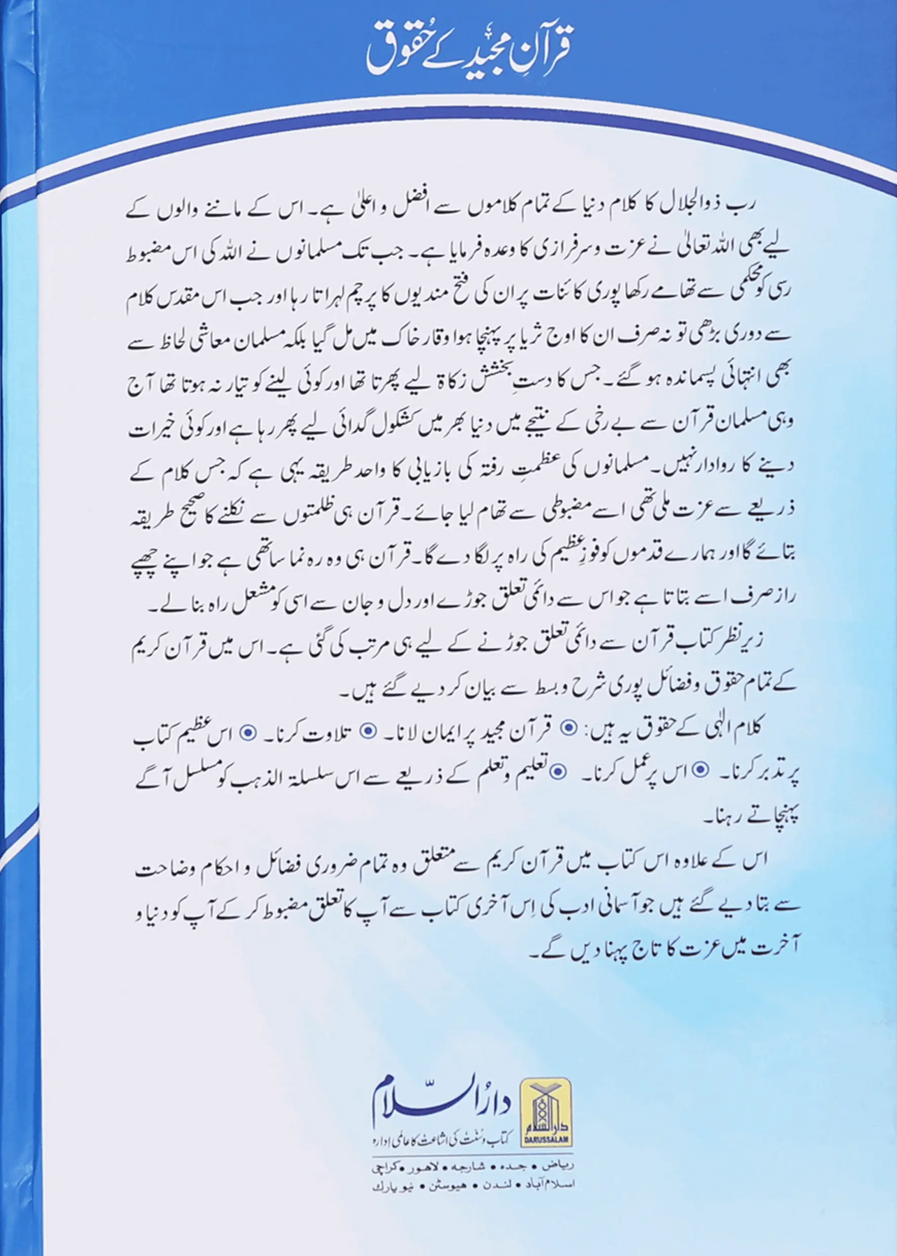 Quran Majeed k Haqooq har momin ke liye raushan raah aur zindagi ka asal dastoor hain. Allah Ta’ala ne Quran ko insanon ki hidayat ke liye nazil farmaya, is liye iske huqooq ko ada karna hamari zimmedari hai. Sabse pehla haqq yeh hai ke Quran par yaqeen rakha jaye aur usse Allah ka kalam samajh kar qabool kiya jaye. Doosra haqq yeh hai ke Quran ko padhna aur uski tilawat adaab ke sath ki jaye. Teesra haqq Quran ko samajhna aur uske tarjume o tafseer ka mutala karna hai. Aik aur aham haqq yeh hai ke Quran ki hifazat ki jaye aur usay zindagi ke har pehlu mein amal mein laya jaye. Quran Majeed k Haqooq mein yeh bhi shamil hai ke iski taleemat ko agle naslon tak pohchaya jaye aur iski izzat aur ta’zeem hamesha barqarar rakhi jaye. Har Muslim ko chahiye ke wo in huqooq ki pabandi kare aur apni zindagi ko Quran ke mutabiq dhalne ki koshish kare.
